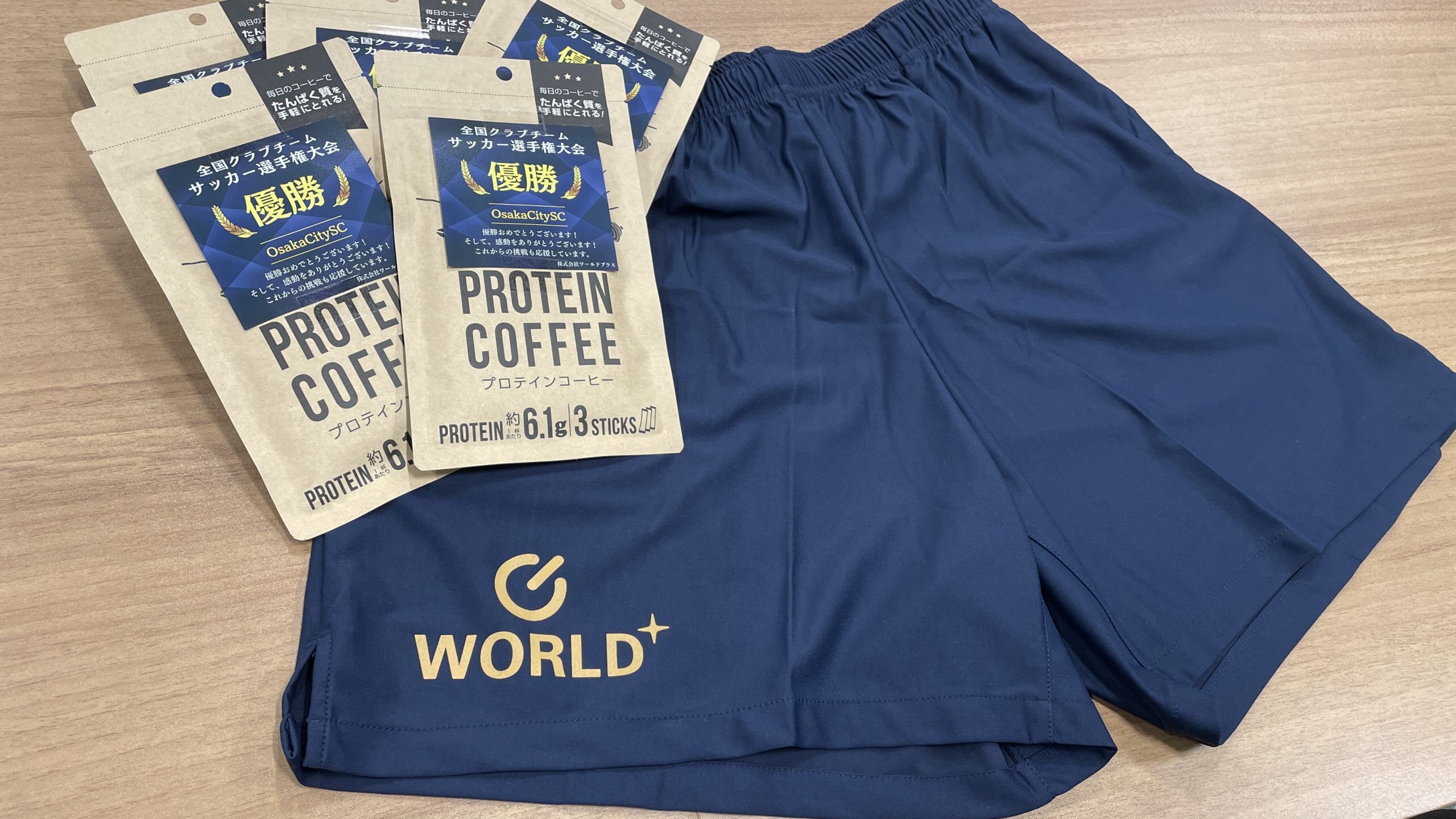 トップスポンサーである株式会社ワールドプラス様より、お祝いとしてワールドプラスオリジナルのトレーニングパンツとプロテインコーヒーをお贈りいただきました。