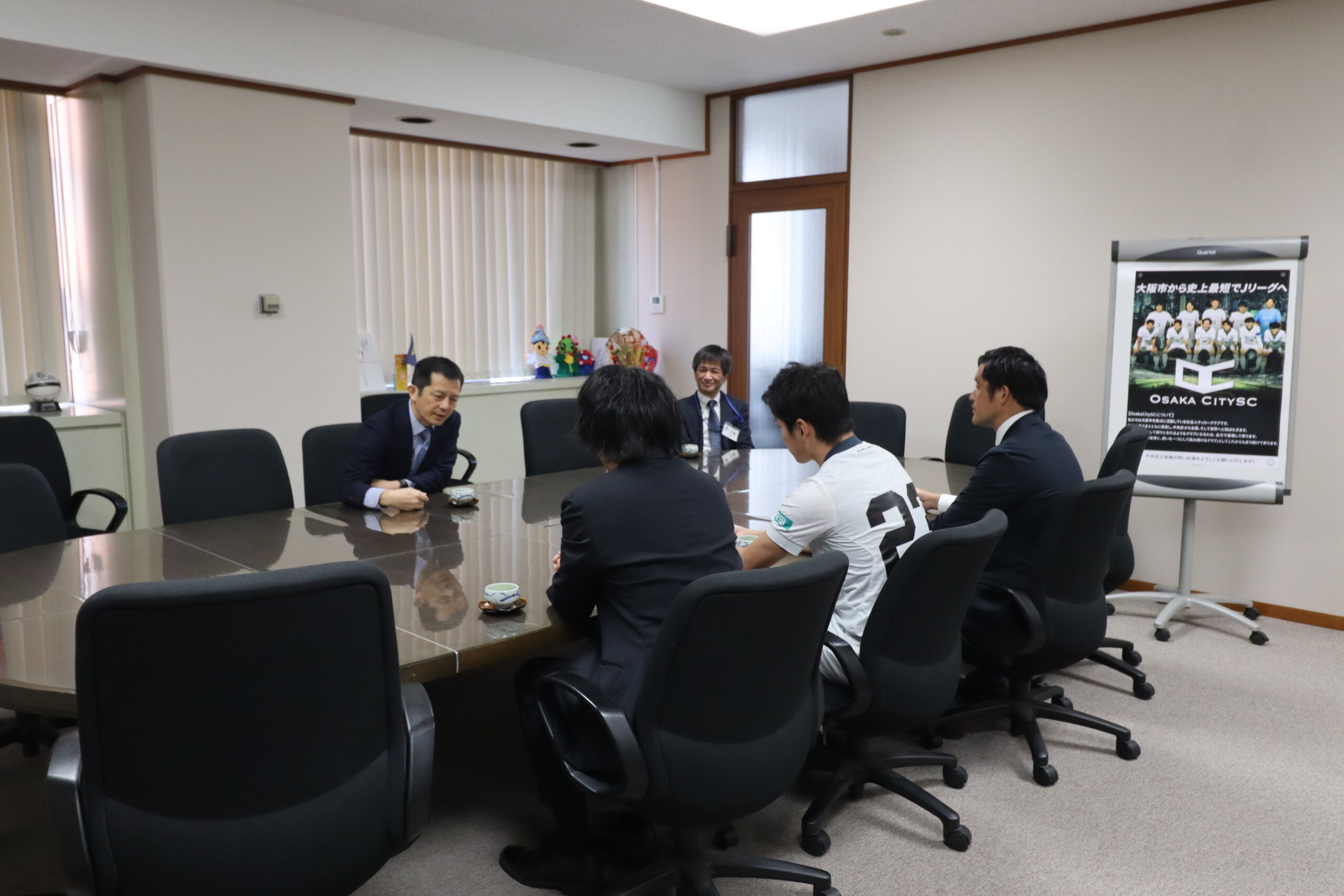 このたびOsaka City SCは、関西サッカーリーグDivision2への昇格決定を報告するため、大阪市中央区役所 松田彰久区長への表敬訪問を行いました。
