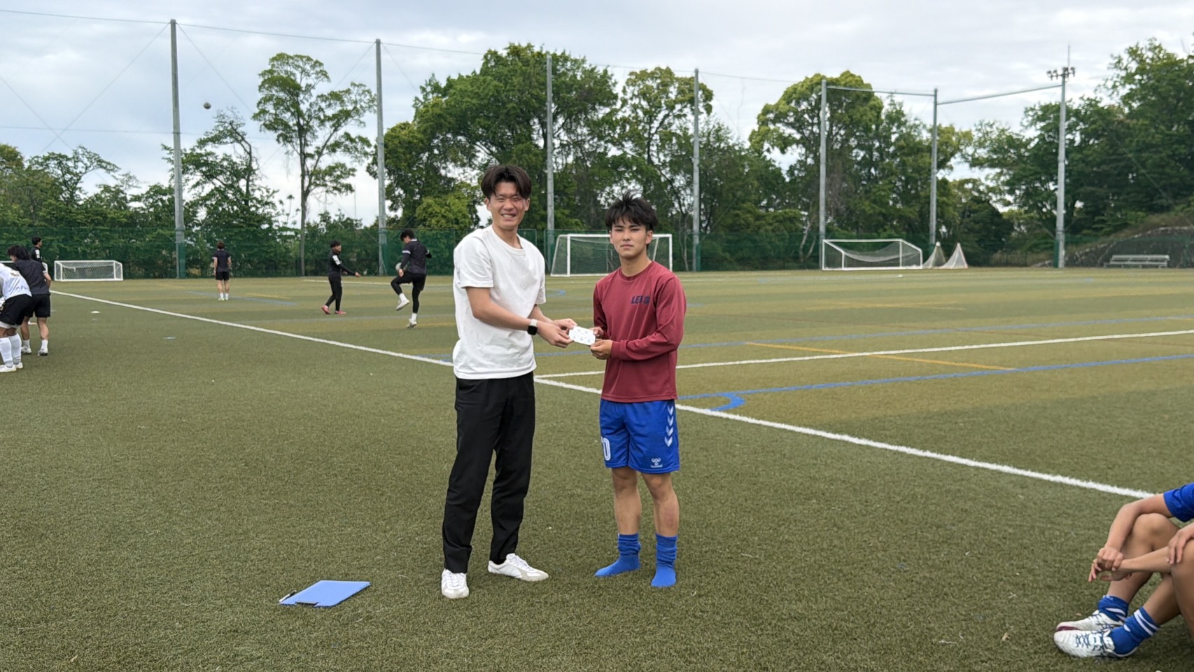 試合後にセレモニーを実施し、追手門学院大学 一ノ瀬選手に「山尾建設賞」としてMVP賞品の贈呈。チーム全員へスポーツドリンクをご提供いただきました。