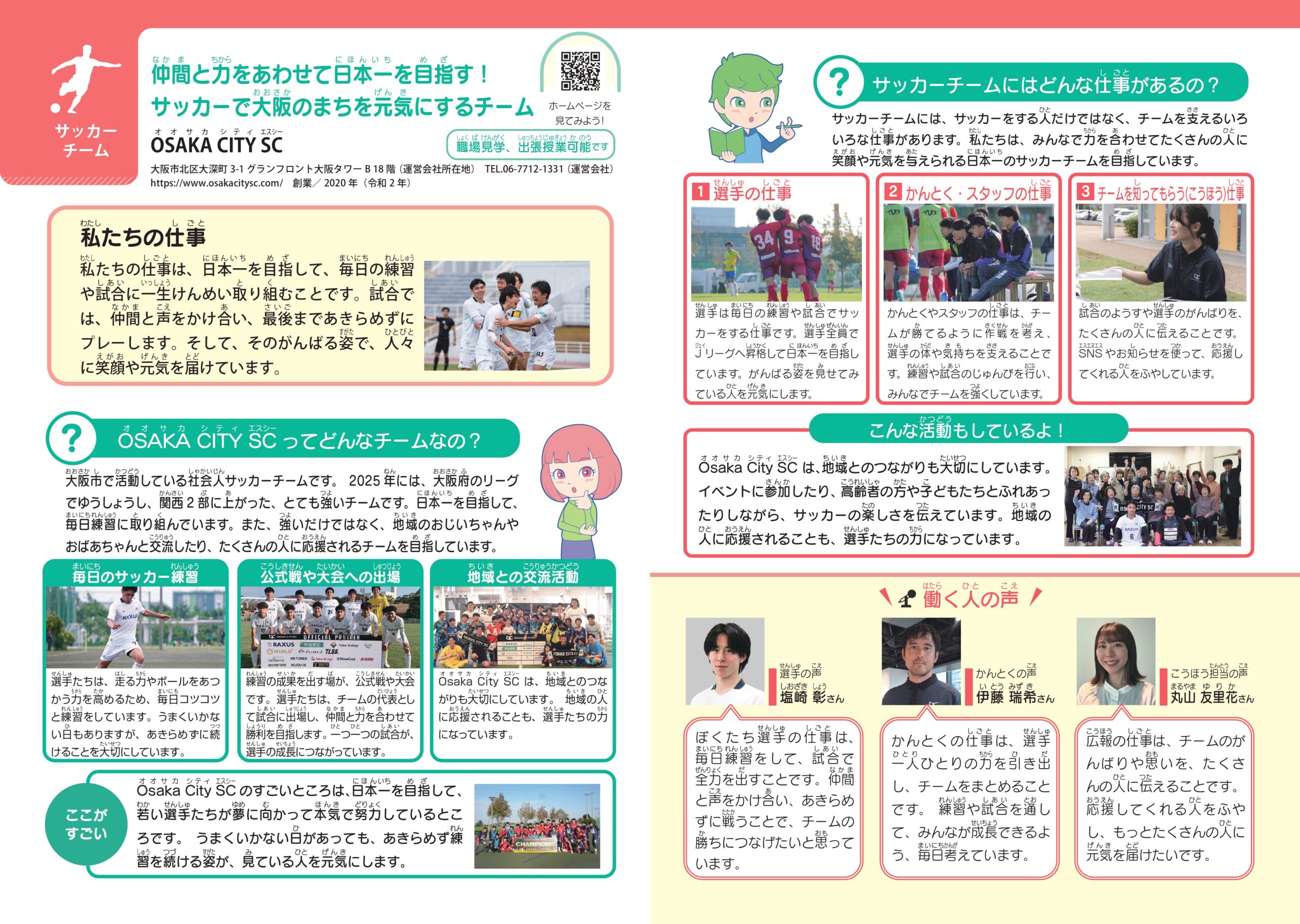 今回は、大阪市内の小学3年生に寄贈される冊子に、OsakaCitySCのお仕事内容について、掲載いただきました。